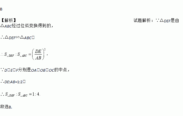 B 【解析】试题解析:∵△DEF是由△ABC经过位似变换得到的, ∴△DEF∽△ABC, ∵D,E,F分别是OA,OB,OC的中点, ∴DE:AB=1:2, ∴ 故选B.