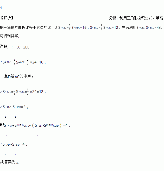如图,在△ABC中E是BC上的一点,EC=2BE,点D是AC的中点,设△ABC,△ADF,△BEF的面积分别为且=24,则=___________