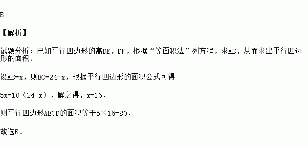 如图,平行四边形ABCD中,DE⊥AB于E,DF⊥BC于F,若的周长为48,DE=5,DF=10,则的面积等于( )