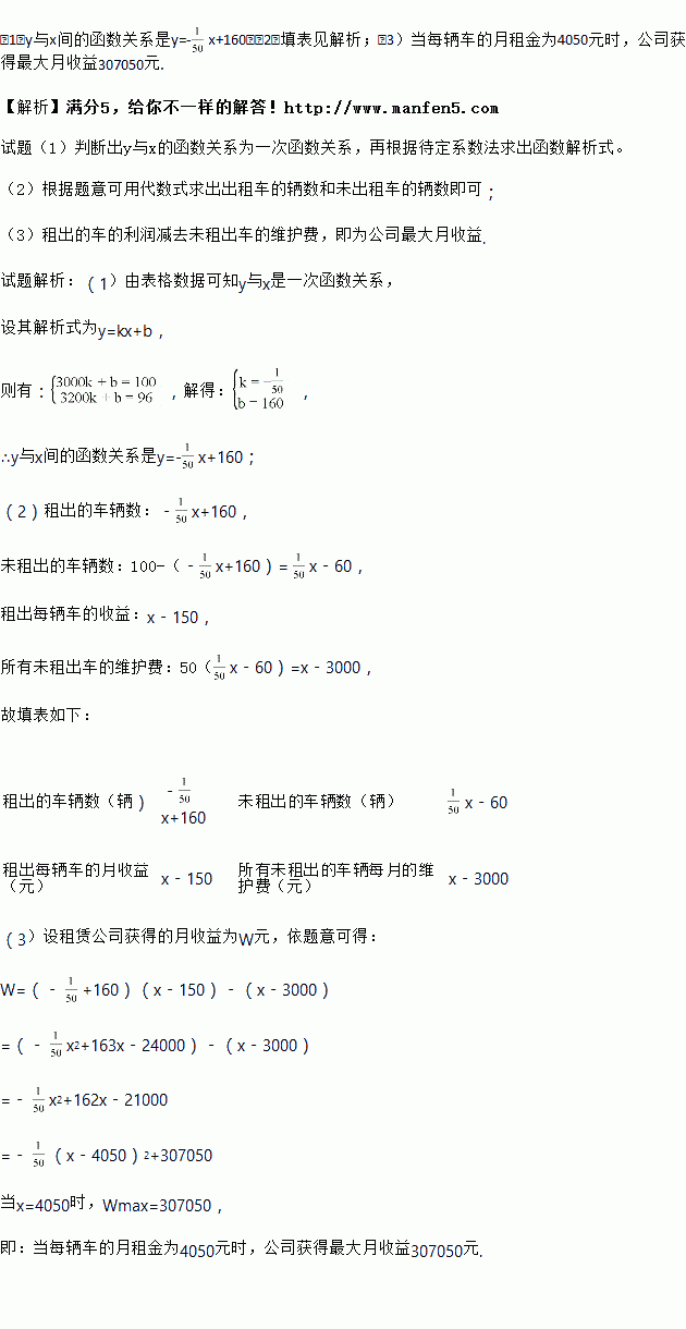 汽车租赁公司拥有某种型号的汽车100辆.公司在经营中发现每辆车的月租金x(元)与每月租出的车辆数(y)有如下关系: