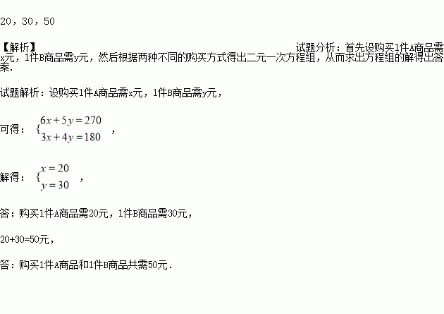 购买6件A商品和5件B商品共需270元,购买3件A商品和4件B商品共需180元.问:购买1件A商品和1件B商品共需多少元?