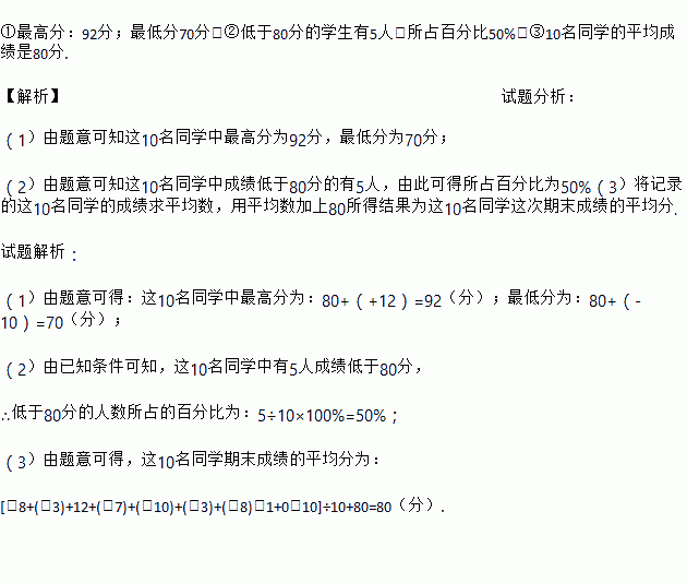 某班抽查了10名同学的期末成绩,以80分为基准,超出的记为正数,不足的记为负数,记录的结果如下:+8,-3,+12,-7,-10,-3,-8,+1,0,+10.