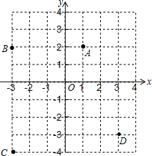 (3)写出A、B、C、D四点到x轴和y轴的距离:A(1,2)到x轴的距离为2,到y轴的距离为1.B(-3,2)到x轴的距离为2,到y轴的距离为3.