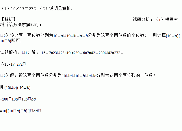 (1)16×17=272;(2)说明见解析. 【解析】试题分析:(1)根据材料所给方法求解即可; (2)设这两个两位数分别为10+a,10+b(a,b分别为这两个两位数的个位数),则计算(10+a)( 10+b)即可. 试题解析:(1)【解析】 16+7=23;23×10 =230;6×7=42;230+42=272. ∴16×17=272. (2)【解析】 设这...