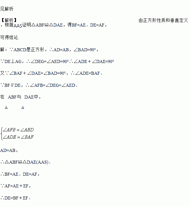 如图,点P是正方形ABCD的边BC上的任意一点,连接AP,作DE⊥AP,垂足是E,BF⊥AP,垂足是F.求证:DE=BF+EF.
