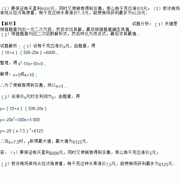 (1)要保证每天盈利6000元,同时又使顾客得到实惠,那么每千克应涨价5元;(2)若该商场单纯从经济角度看,每千克这种水果涨价7.5元,能使商场获利最多为6125元. 【解析】试题分析:(1)关键是根据题意列出一元二次方程,然后求出其解,最后根据题意确定其值. (2)根据题意列出二次函数解析式,然后转化为顶点式,最后求其最值. 试题解析:(1)设每千克应涨价x元,由题意,得 (10...