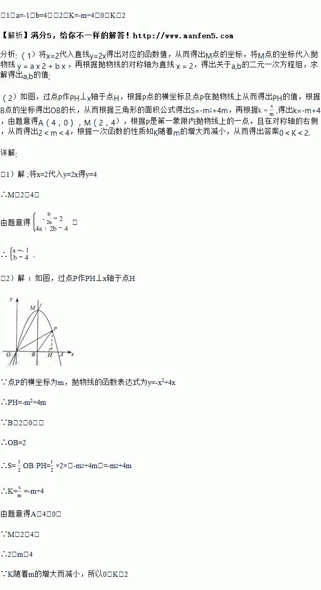 如图,抛物线y=ax2+bx(a≠0) 交x轴正半轴于点A,直线y=2x 经过抛物线的顶点M.已知该抛物线的对称轴为直线x=2,交x轴于点B.