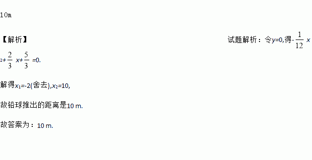 如图,一男生推铅球时,铅球行进高度y(m)与水平距离x(m)之间满足函数关系式y=-x2+x+,则铅球推出的距离为_____.