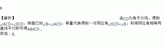 B 【解析】由CD为角平分线,得到∠ACD=∠ECD,根据已知∠B=∠ACD,等量代换得到一对同位角∠ECD=∠B,利用同位角相等两直线平行即可得AB∥CD, 故选:B.