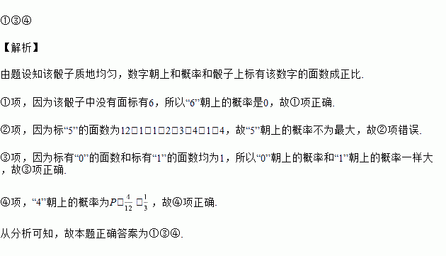 如图,有一枚质地均匀的正十二面体形状的骰子,其中个面标有“![]()