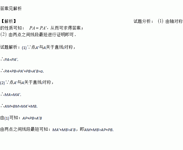 (2)若点M是直线l上异于P点的任意一点,求证:AM+MB>AP+PB.
