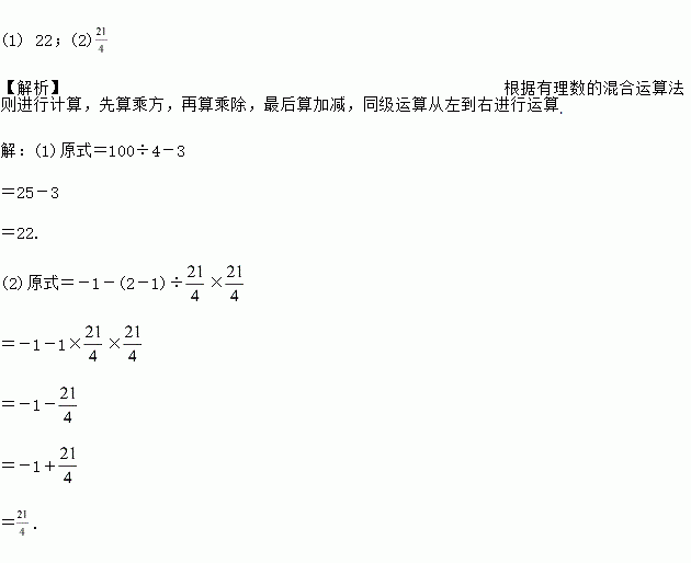 计算:(1) 100÷(-2)2-(-2)÷(-);