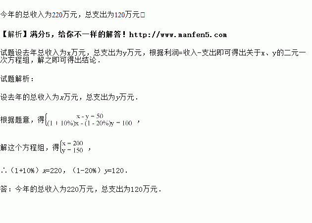 某工厂去年的总收入比总支出多50万元,计划今年的总收入比去年增加10%,总支出比去年节约20%,按计划今年总收入将比总支出多100万元.今年的总收入和总支出计划各是多少万元?