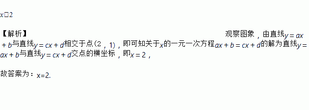 如图,直线y=ax+b与直线y=cx+d相交于点(2,1),则关于x的一元一次方程ax+b=cx+d的解为__________.