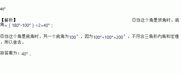 40° 【解析】①当这个角是顶角时,底角=(180°-100°)÷2=40°; ②当这个角是底角时,另一个底角为100°,因为100°+100°=200°,不符合三角形内角和定理,所以舍去, 故答案为:40°.