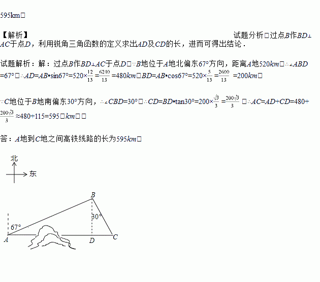 如图,C地在A地的正东方向,因有大山阻隔,由A地到C地需绕行B地,已知B地位于A地北偏东67°方向,距离A地520km,C地位于B地南偏东30°方向,若打通穿山隧道,建成两地直达高铁,求A地到C地之间高铁线路的长.(结果保留整数)