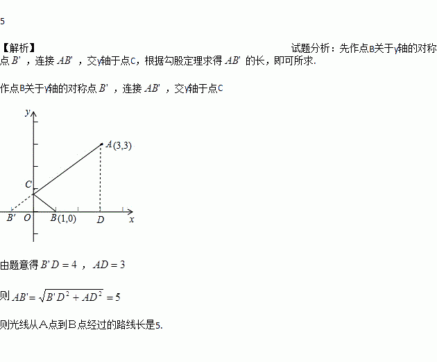 如图所示,一束光线从点A(3,3)出发,经过y轴上的C反射后经过点B(1,0),则光线从A点到B点经过的路线长是_______.
