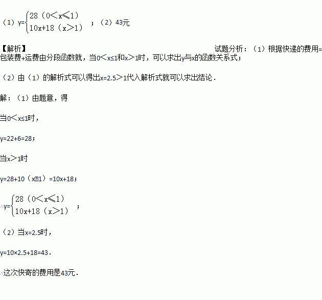 (2014•陕西)小李从西安通过某快递公司给在南昌的外婆寄一盒樱桃,快递时,他了解到这个公司除收取每次6元的包装费外,樱桃不超过1kg收费22元,超过1kg,则超出部分按每千克10元加收费用.设该公司从西安到南昌快递樱桃的费用为y(元),所寄樱桃为x(kg).