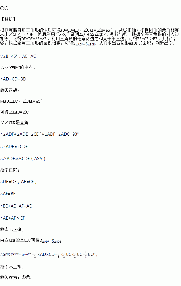 将一副三角板按如图所示的方式摆放,其中△ABC为含有45°角的三角板,直线AD是等腰直角三角板的对称轴,且斜边上的点D为另一块三角板DMN的直角顶点,DM、DN分别交AB、AC于点E、F.则下列四个结论:①BD=AD=CD;②△AED≌△CFD;③BE+CF=EF;④S四边形AEDF=