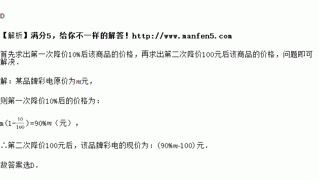 某品牌彩电原价为m元,第一次降价10%,第二次降价100元,那么该品牌彩电的现价( )