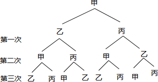 10.甲、乙、丙三人参加排球传球训练,从甲开始发球,记作一次传球,经过三次传球后,请用树形图或列表求出球仍回到甲手中的概率.分析 首先根据题意画出树状图,然后由树状图求得所有等可能的结果与球仍回到甲手中的情况,再利用概率公式即可求得答案.