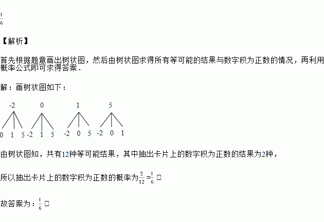 有四张卡片,分别写有数﹣2,0,1,5,将它们背面朝上(背面无差别)洗匀后放在桌上,从中任意抽出两张,则抽出卡片上的数的积是正数的概率是__.