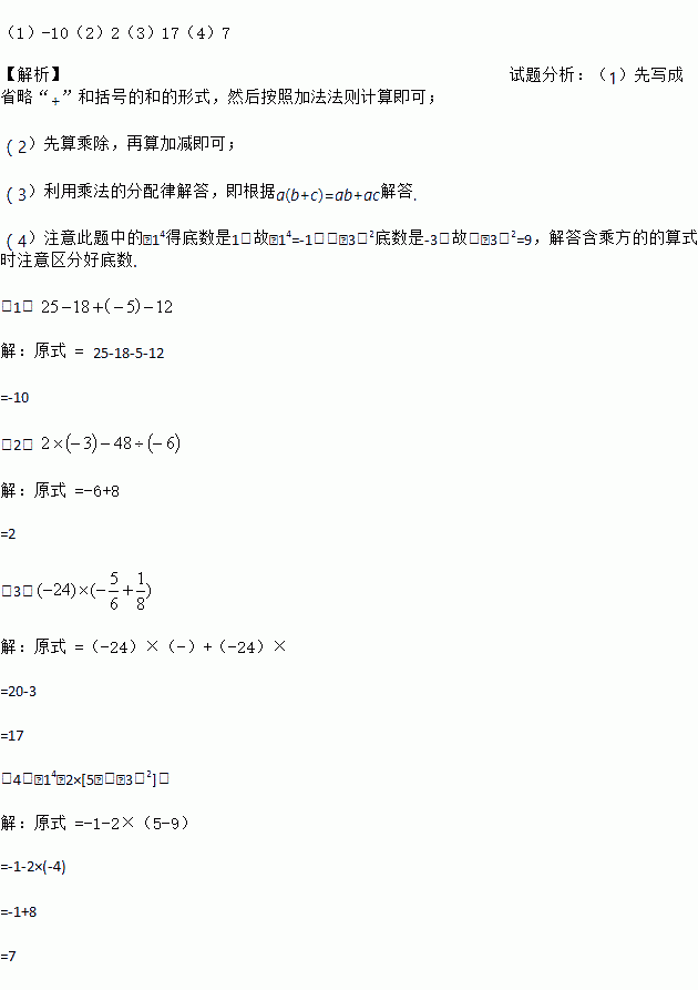 (1)-10(2)2(3)17(4)7 【解析】试题分析:(1)先写成省略“+”和括号的和的形式,然后按照加法法则计算即可; (2)先算乘除,再算加减即可; (3)利用乘法的分配律解答,即根据a(b+c)=ab+ac解答. (4)注意此题中的﹣14得底数是1,故﹣14=-1;(﹣3)2底数是-3,故(﹣3)2=9,解答含乘方的的算式时注意区分好底数. (1) 【...
