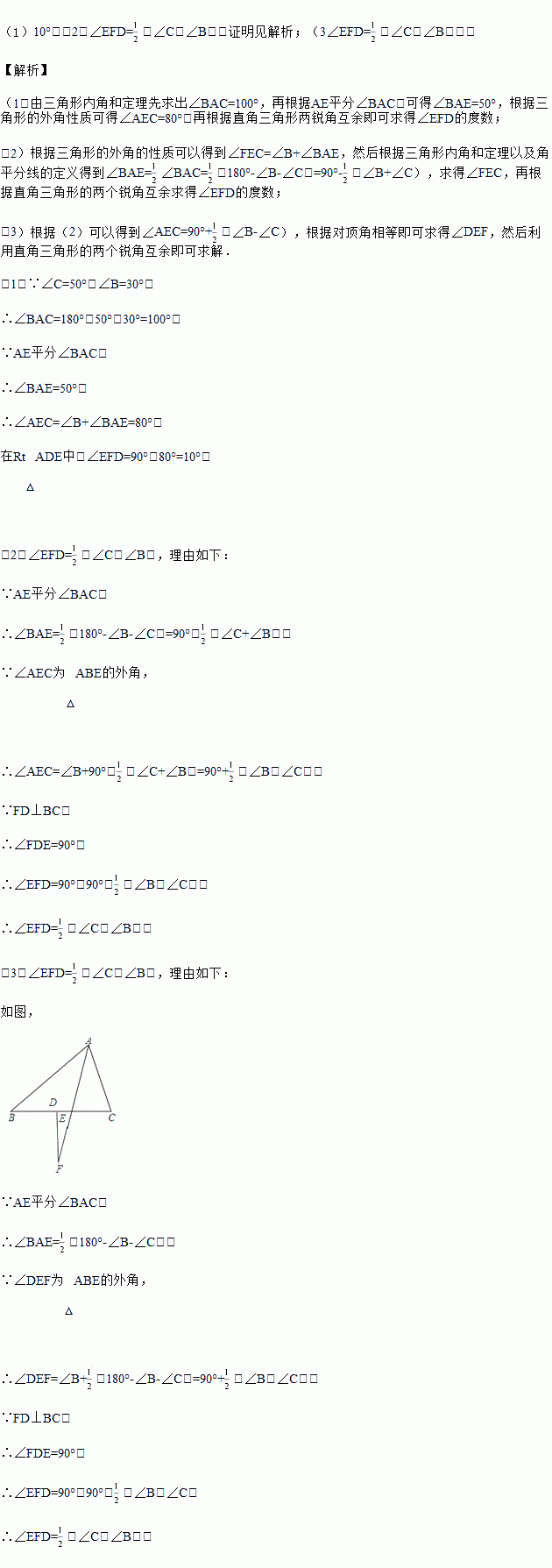 (3)如果点F在△ABC外部,如图3,此时∠EFD与∠C﹣∠B的数量关系是否会发生变化?请说明理由.