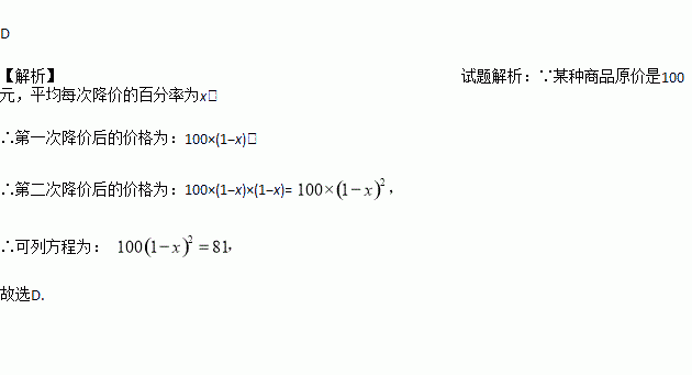 某商品经过连续两次降价,销售单价由原来 100 元降到 81 元。设平均每次降价的百分率为 x,根据题意可列方程为( )
