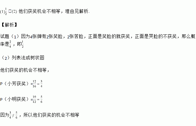 现小芳有一次翻牌机会,若正面是笑脸的就获奖,正面是哭脸的不获奖![]()