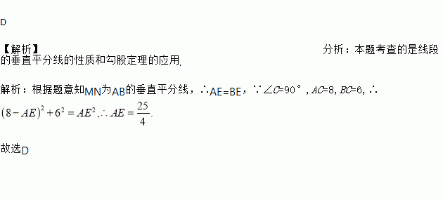 AB长为半径作弧,两弧分别交于M,N两点,过M,N两点的直线交AC于点E,若AC=8,BC=6,则AE的长为: