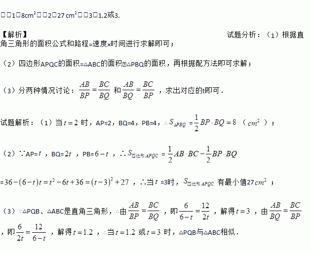 如图,在△ABC中,AB=6cm,BC=12cm,∠B=90°.点P从点A开始沿AB边向点B以1cm/s的速度移动,点Q从点B开始沿BC边向点C以2cm/s的速度移动,如果P,Q分别从A,B同时出发,设移动时间为t(s).