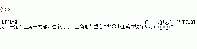 ①③ 【解析】【解析】 三角形的三条中线的交点一定在三角形内部,这个交点叫三角形的重心.故①③正确.故答案为:①③.