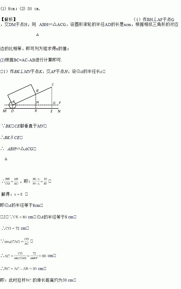 有一只拉杆式旅行箱(图1),其侧面示意图如图2所示.已知箱体长AB=50cm,拉杆的伸长距离最大时可达35cm,点A,B,C在同一条直线上.在箱体底端装有圆形的滚轮⊙A,⊙A与水平地面MN相切于点D.在拉杆伸长至最大的情况下,当点B距离水平地面38cm时,点C到水平地面的距离CE为59cm.![]()