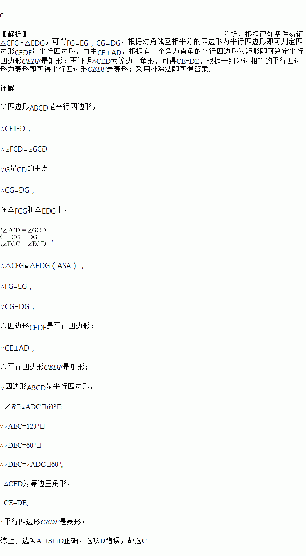 如图,平行四边形ABCD中,∠B=60°.G是CD的中点,E是边AD上的动点,EG的延长线与BC的延长线交于点F,连结CE,DF,下列说法不正确的是( )