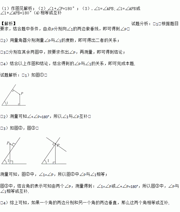 (1)作图见解析;(2)∠1+∠P=180°;(3).∠1=∠APB;∠1=∠APB或∠1+∠APB=180°(4)相等或互补 【解析】试题分析:(1)根据题目要求,结合题中条件,由点P分别向∠1的两边做垂线,即可得到∠P; (2)用量角器分别测量∠P与∠1的度数,即可得出二者的关系; (3)分别在其余两图中,按要求作出∠P,再测量,即可得到结论; (4)结合以上作图和结论...