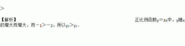 已知函数y=3x的图象经过点A(-1,y1)、点B(-2,y2),则y1________y2(填“>”或“<”或“=”).