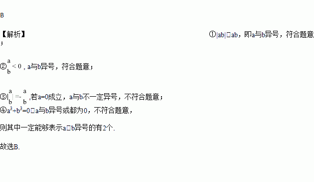 已知a、b为有理数,下列式子:①|ab|>ab;② ;③ ;④a3+b3=0,其中一定能够表示a、b异号的有( )