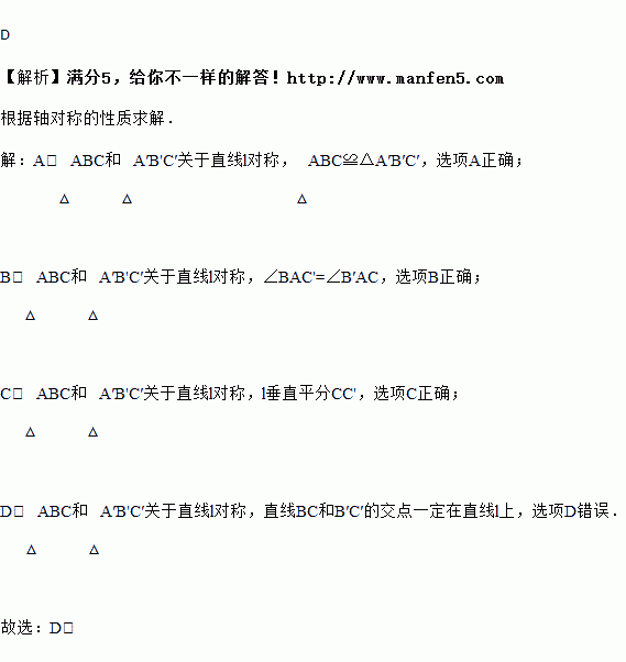 C. l垂直平分CC′ D. 直线BC和B′C′的交点不在直线l上