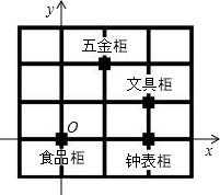 则各个柜台的坐标为:食品柜(0,0),钟表柜(2,0),五金柜(1,2),文具柜(2,1).