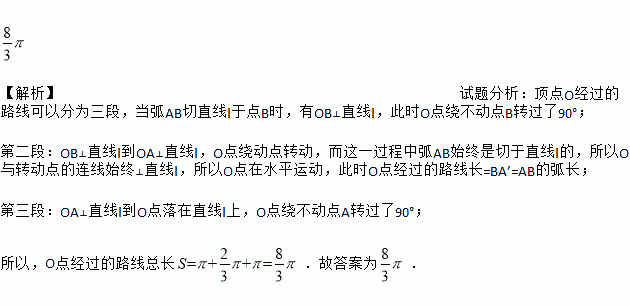 如图,将半径为2,圆心角为60°的扇形纸片AOB,在直线l上向右作无滑动的滚动至扇形A′O′B′处,则顶点O经过的路线总长为_____.