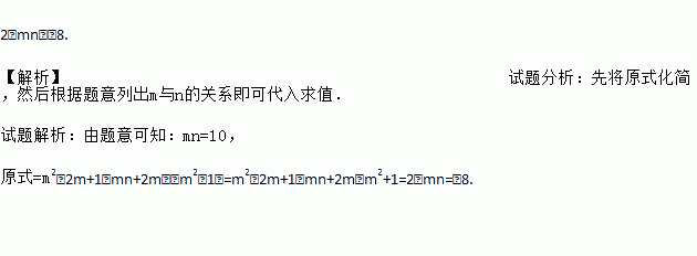 2﹣mn,﹣8. 【解析】试题分析:先将原式化简,然后根据题意列出m与n的关系即可代入求值. 试题解析:由题意可知:mn=10, 原式=m2﹣2m+1﹣mn+2m﹣(m2﹣1)=m2﹣2m+1﹣mn+2m﹣m2+1=2﹣mn=﹣8.