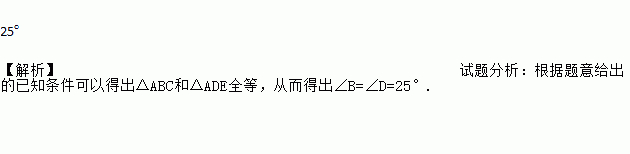 已知,如图,AC=AE,∠1=∠2,AB=AD,若∠D=25°,则∠B的度数为 _________.