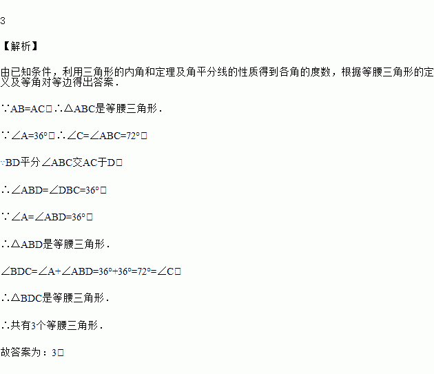 如图,在ΔABC中,∠A=36°,AB=AC,BD平分∠ABC,则图中等腰三角形的个数是__________