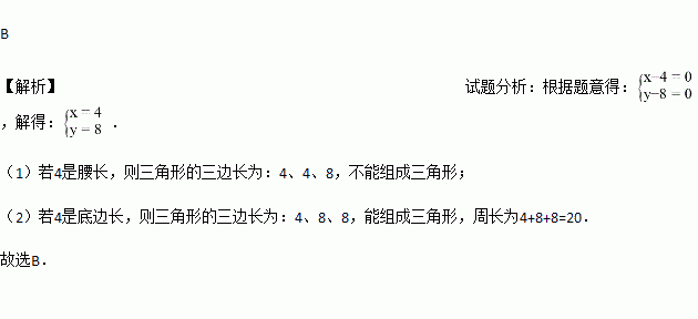 已知实数x,y满足,则以x,y的值为两边长的等腰三角形的周长是( )