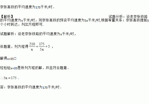 京张高铁的平均速度为175千米/时. 【解析】试题分析:设老京张铁路的平均速度为x千米/时,则京张高铁的预设平均速度为5x千米/时,根据等量关系:京张高铁提前5个小时到达,列出方程即可. 试题解析:设老京张铁路的平均速度为x千米/时, 依题意,列方程得, 解得x=35, 经检验x=35是所列方程的解,并且符合题意. . 答:京张高铁的平均速度为175千米/...