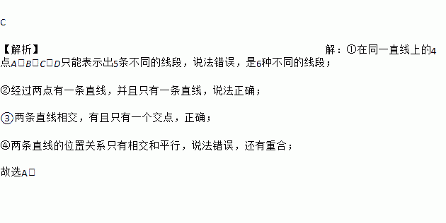 以下四个说法中:①在同一直线上的4点A、B、C、D只能表示出5条不同的线段;②经过两点有一条直线,并且只有一条直线;③两条直线相交,有且只有一个交点;④在同一平面内,两条直线的位置关系只有相交和平行.正确的是( )