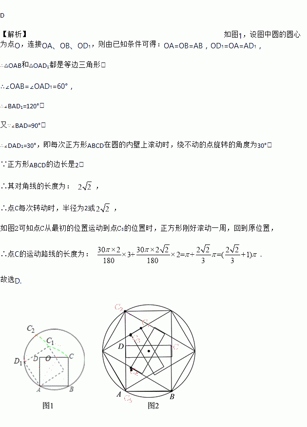 如图,边长为2的正方形ABCD的顶点A、B在一个半径为2的圆上, 顶点C、D在圆内,将正方形ABCD沿圆的内壁作无滑动的滚动.当滚动一周回到原位置时,点C运动的路径长为 ( )