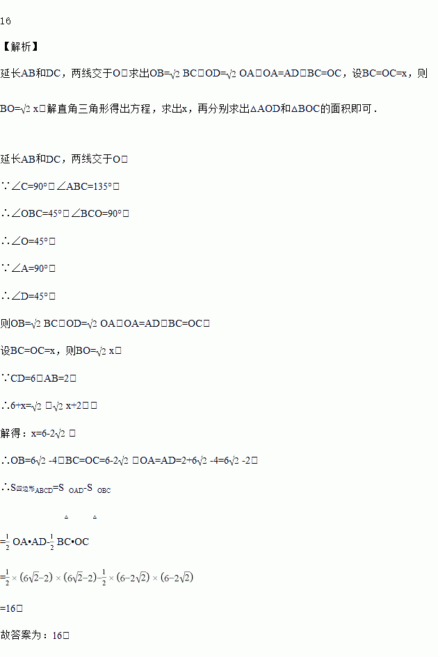 如图,四边形ABCD中,∠A=∠C=90°,∠ABC=135°,CD=6,AB=2,则四边形ABCD的面积为___________