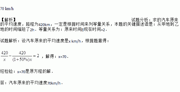 某内陆城市为了落实国家“一带一路”战略,促进经济发展,增强对外贸易的竞争力,把距离港口420 km的普通公路升级成了同等长度的高速公路,结果汽车行驶的平均速度比原来提高了50%,行驶时间缩短了2 h,求汽车原来的平均速度.